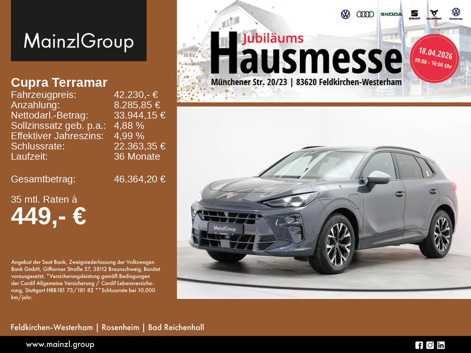 Garantie 60 Monate ab Tag der Erstzulassung, maximal 150.000 km, Winterräder ggf. gegen Aufpreis vorhanden, sprechen Sie unser Verkaufspersonal darauf an., Angaben zum Hersteller: SEAT Deutschland GmbH, Cupra, Max-Planck-Str. 3-5, 64331 Weiterstadt, 06150-1079991, service(at)cupraofficial.de