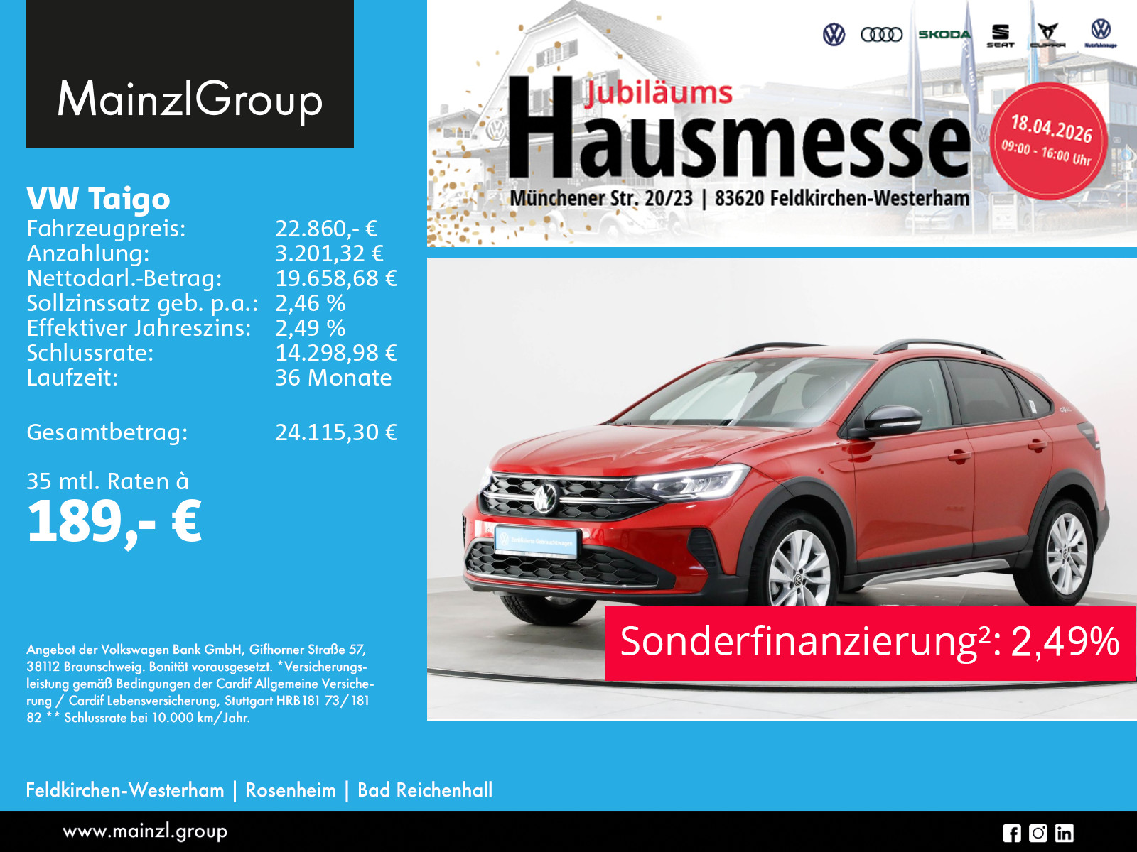 Garantie 24 Monate ab Tag der Erstzulassung, Winterräder ggf. gegen Aufpreis vorhanden, sprechen Sie unser Verkaufspersonal darauf an., Angaben zum Hersteller: Volkswagen AG, Volkswagen, Berliner Ring 2, 38440 Wolfsburg, Deutschland, +49-5361-9-0, kundenbetreuung(at)volkswagen.de, Produktinformationen: https://www.volkswagen.de/idhub/content/dam/onehub_master/downloads/product-safety/volkswagen-sicherheitshinweise-de.pdf