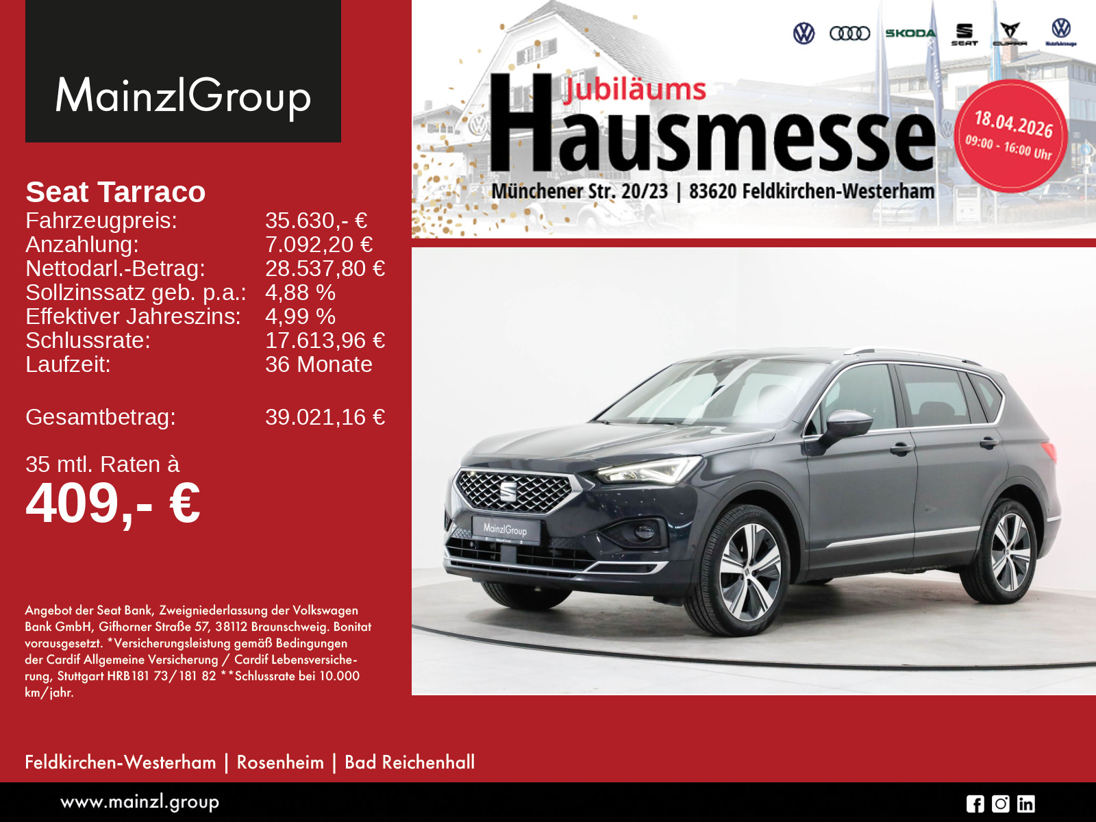 Winterräder ggf. gegen Aufpreis vorhanden, sprechen Sie unser Verkaufspersonal darauf an., Angaben zum Hersteller: SEAT Deutschland GmbH, Seat, Max-Planck-Str. 3-5, 64331 Weiterstadt, 06150-1855-0, service(at)seat.de