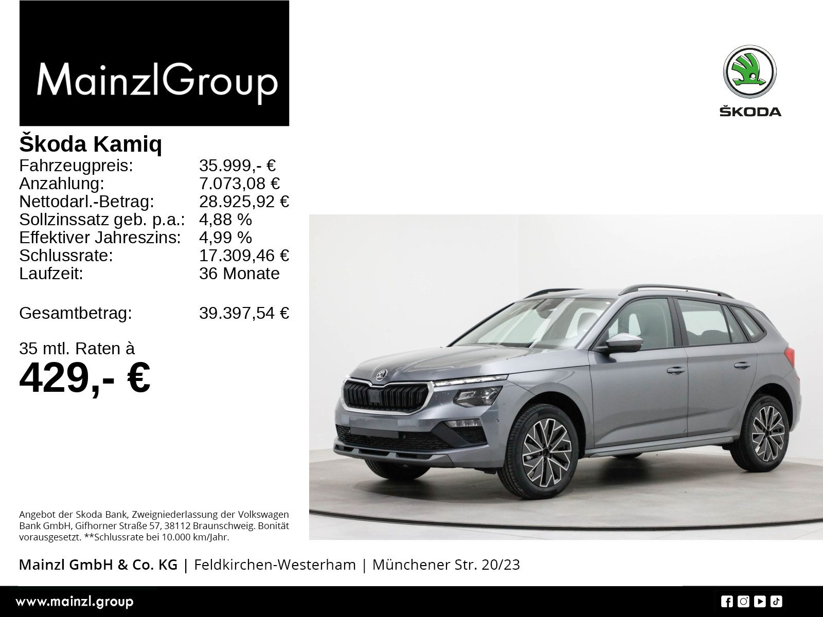 Garantie 24 Monate ab Tag der Erstzulassung, Winterräder ggf. gegen Aufpreis vorhanden, sprechen Sie unser Verkaufspersonal darauf an., Angaben zum Hersteller: Skoda Auto Deutschland GmbH, Skoda, Max-Planck-Str. 3-5, 64331 Weiterstadt, 06150/133-0, info(at)skoda-auto.de