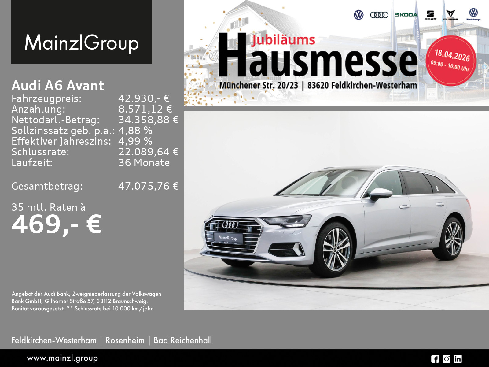 Audi Connect je nach Dienst zeitlich begrenzt, danach kostenpflichtig verlängerbar, Garantie 60 Monate ab Tag der Erstzulassung, Winterräder ggf. gegen Aufpreis vorhanden, sprechen Sie unser Verkaufspersonal darauf an., Angaben zum Hersteller: AUDI AG, Audi, Auto-Union-Straße 1, 85057 Ingolstadt, Deutschland, +49-841-89-0, kundenbetreuung(at)audi.de, Produktinformationen: https://www.audi.de/de/rechtliches/gpsr/