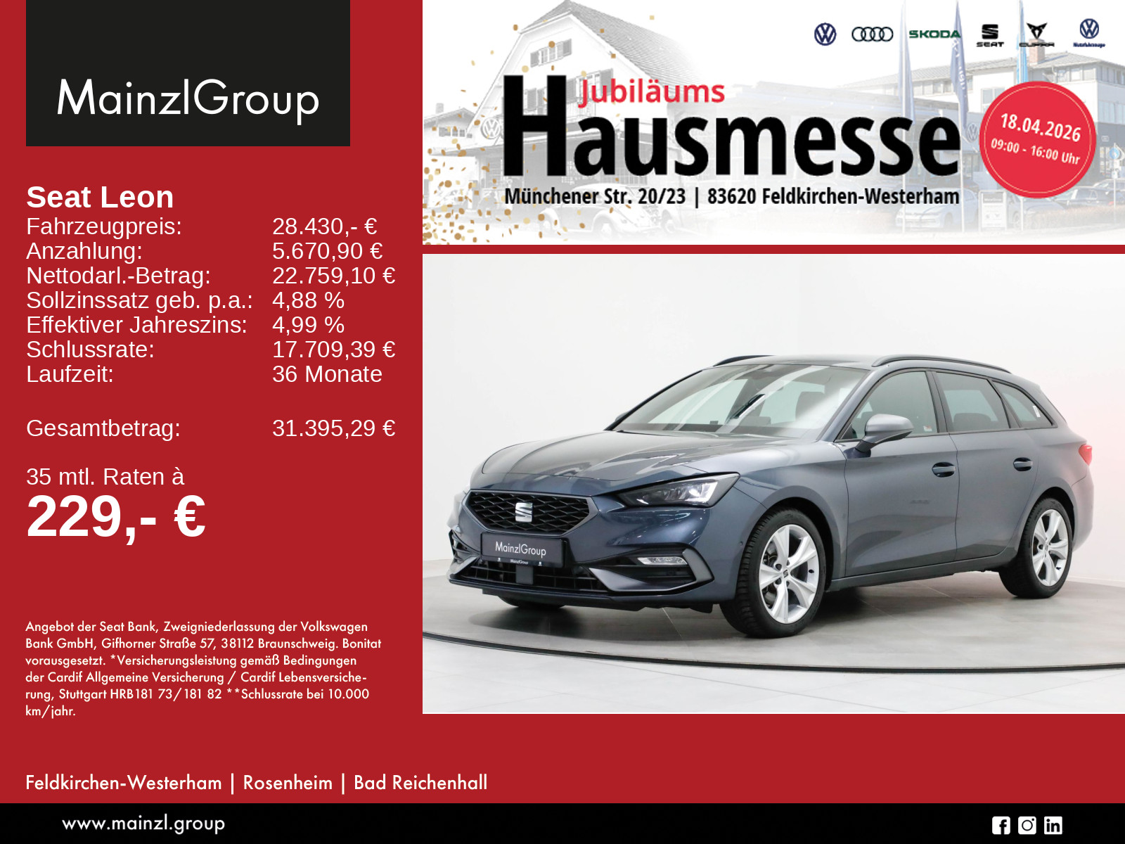 Garantie 24 Monate ab Tag der Erstzulassung, Winterräder ggf. gegen Aufpreis vorhanden, sprechen Sie unser Verkaufspersonal darauf an., Angaben zum Hersteller: SEAT Deutschland GmbH, Seat, Max-Planck-Str. 3-5, 64331 Weiterstadt, 06150-1855-0, service(