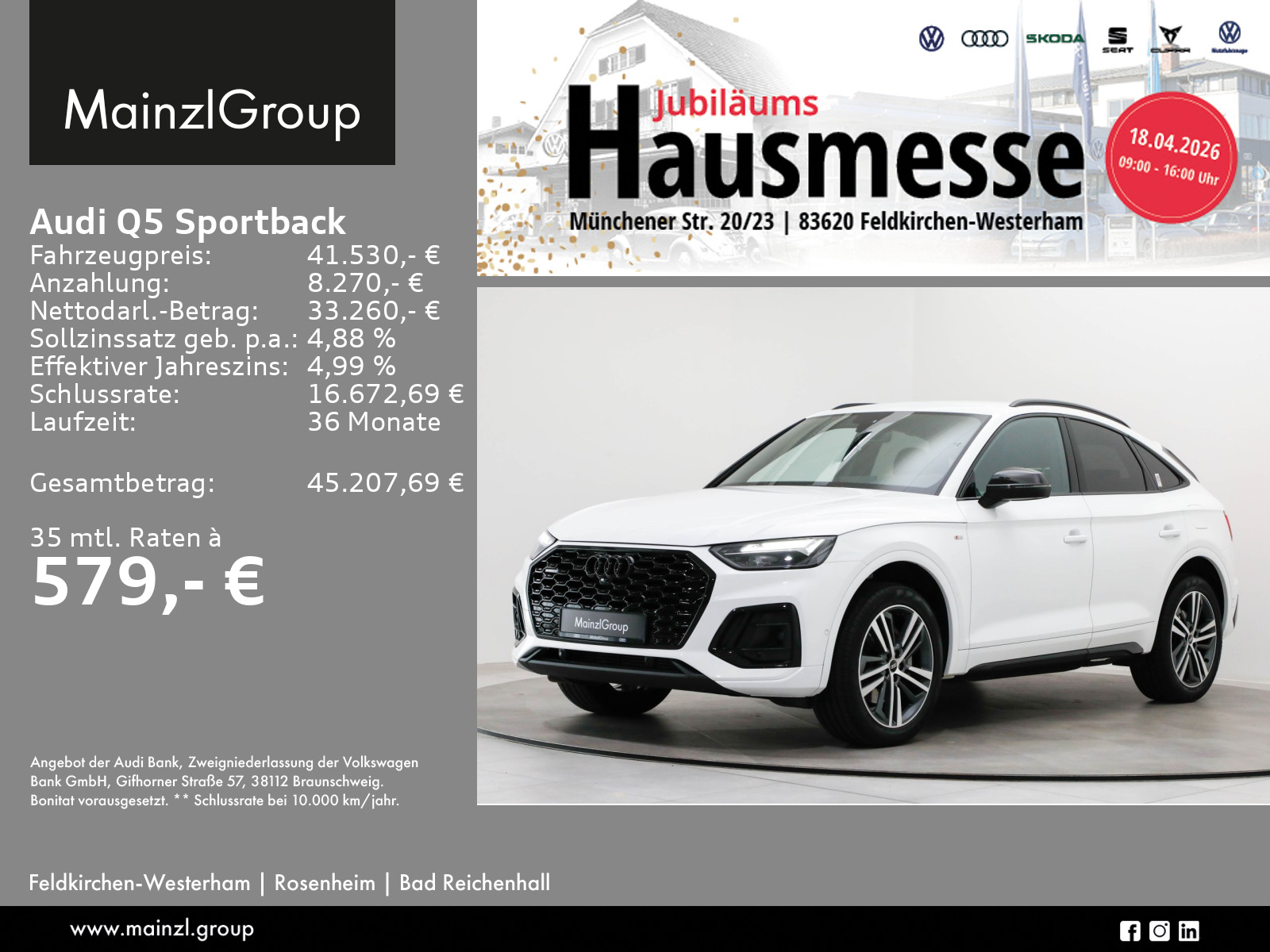 Audi Connect je nach Dienst zeitlich begrenzt, danach kostenpflichtig verlängerbar, Winterräder ggf. gegen Aufpreis vorhanden, sprechen Sie unser Verkaufspersonal darauf an., Angaben zum Hersteller: AUDI AG, Audi, Auto-Union-Straße 1, 85057 Ingolstadt, Deutschland, +49-841-89-0, kundenbetreuung(at)audi.de, Produktinformationen: https://www.audi.de/de/rechtliches/gpsr/