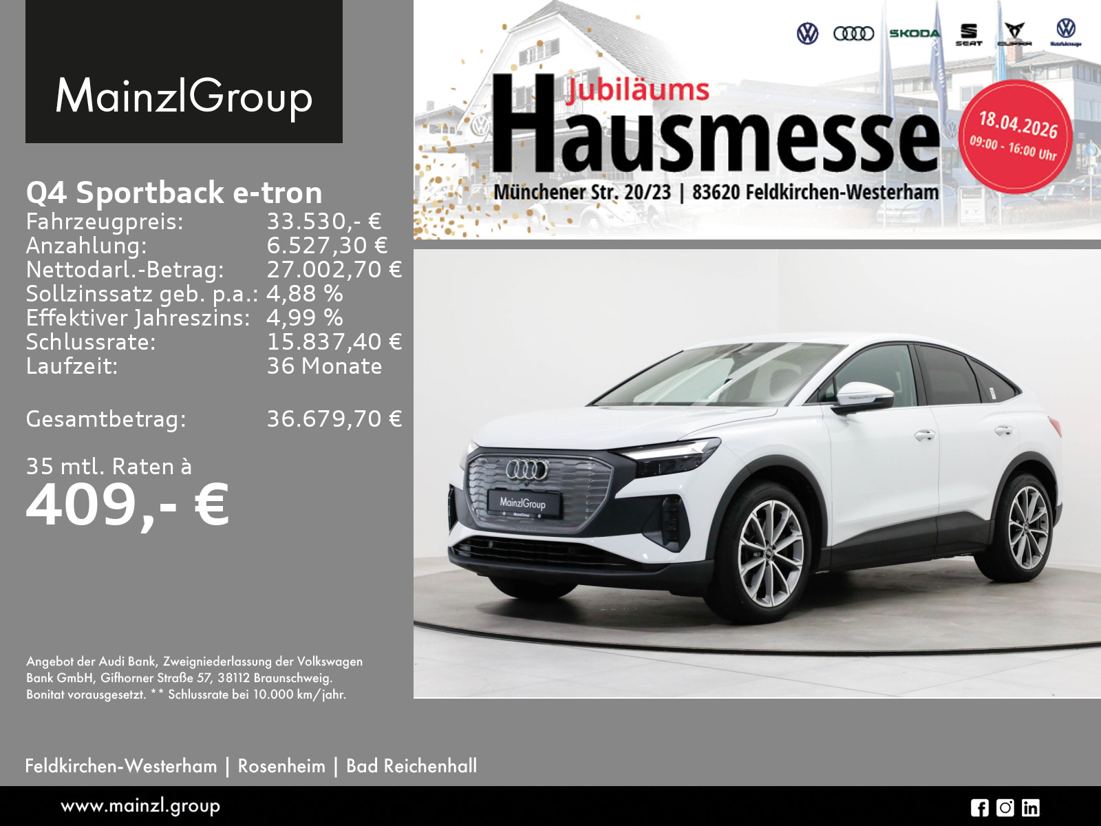 Audi Connect je nach Dienst zeitlich begrenzt, danach kostenpflichtig verlängerbar, Winterräder ggf. gegen Aufpreis vorhanden, sprechen Sie unser Verkaufspersonal darauf an., Angaben zum Hersteller: AUDI AG, Audi, Auto-Union-Straße 1, 85057 Ingolstadt, Deutschland, +49-841-89-0, kundenbetreuung(at)audi.de, Produktinformationen: https://www.audi.de/de/rechtliches/gpsr/