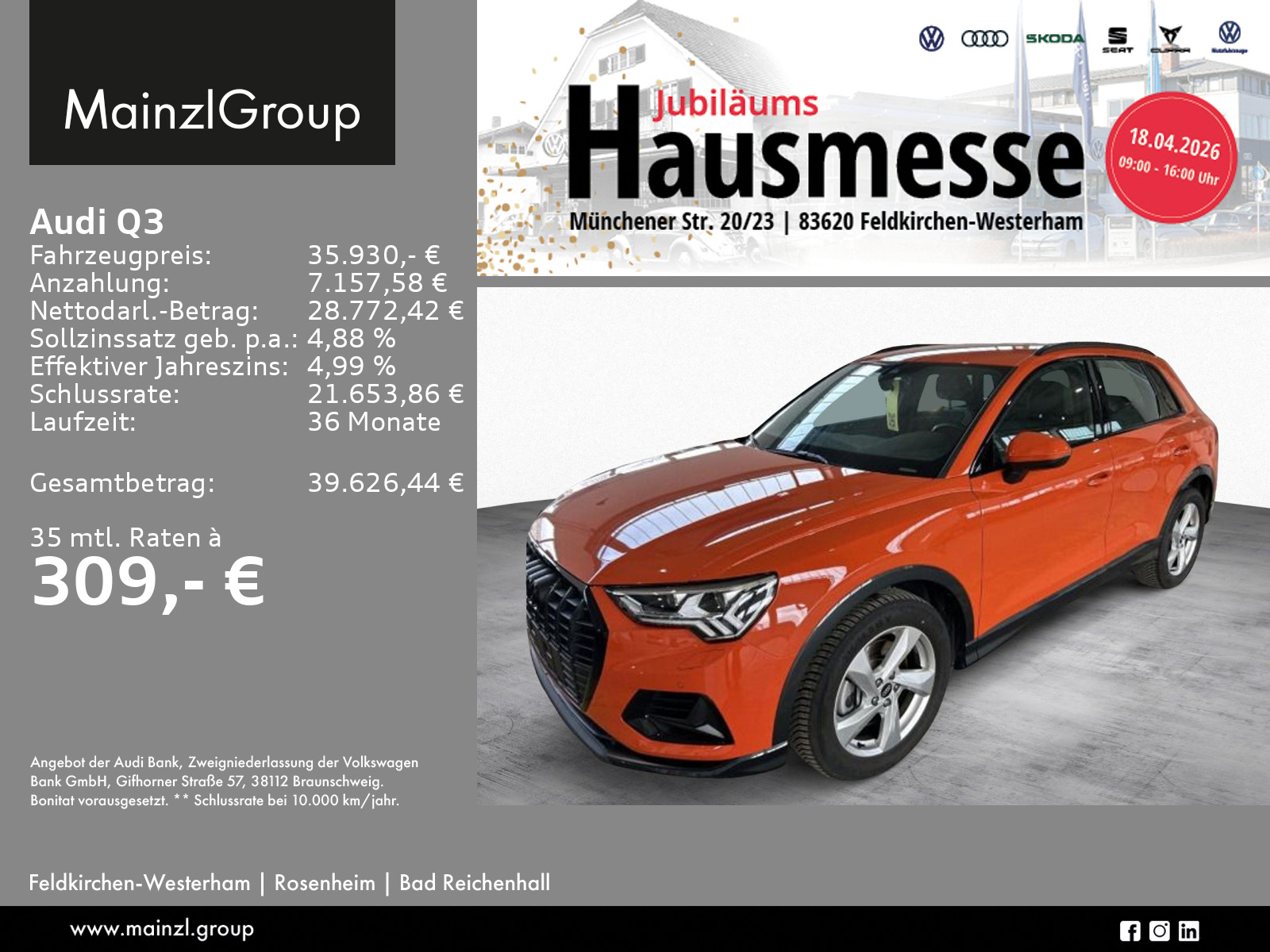 Audi Connect je nach Dienst zeitlich begrenzt, danach kostenpflichtig verlängerbar, Garantie 24 Monate ab Tag der Erstzulassung, Winterräder ggf. gegen Aufpreis vorhanden, sprechen Sie unser Verkaufspersonal darauf an., Angaben zum Hersteller: AUDI AG, Audi, Auto-Union-Straße 1, 85057 Ingolstadt, Deutschland, +49-841-89-0, kundenbetreuung(at)audi.de, Produktinformationen: https://www.audi.de/de/rechtliches/gpsr/
