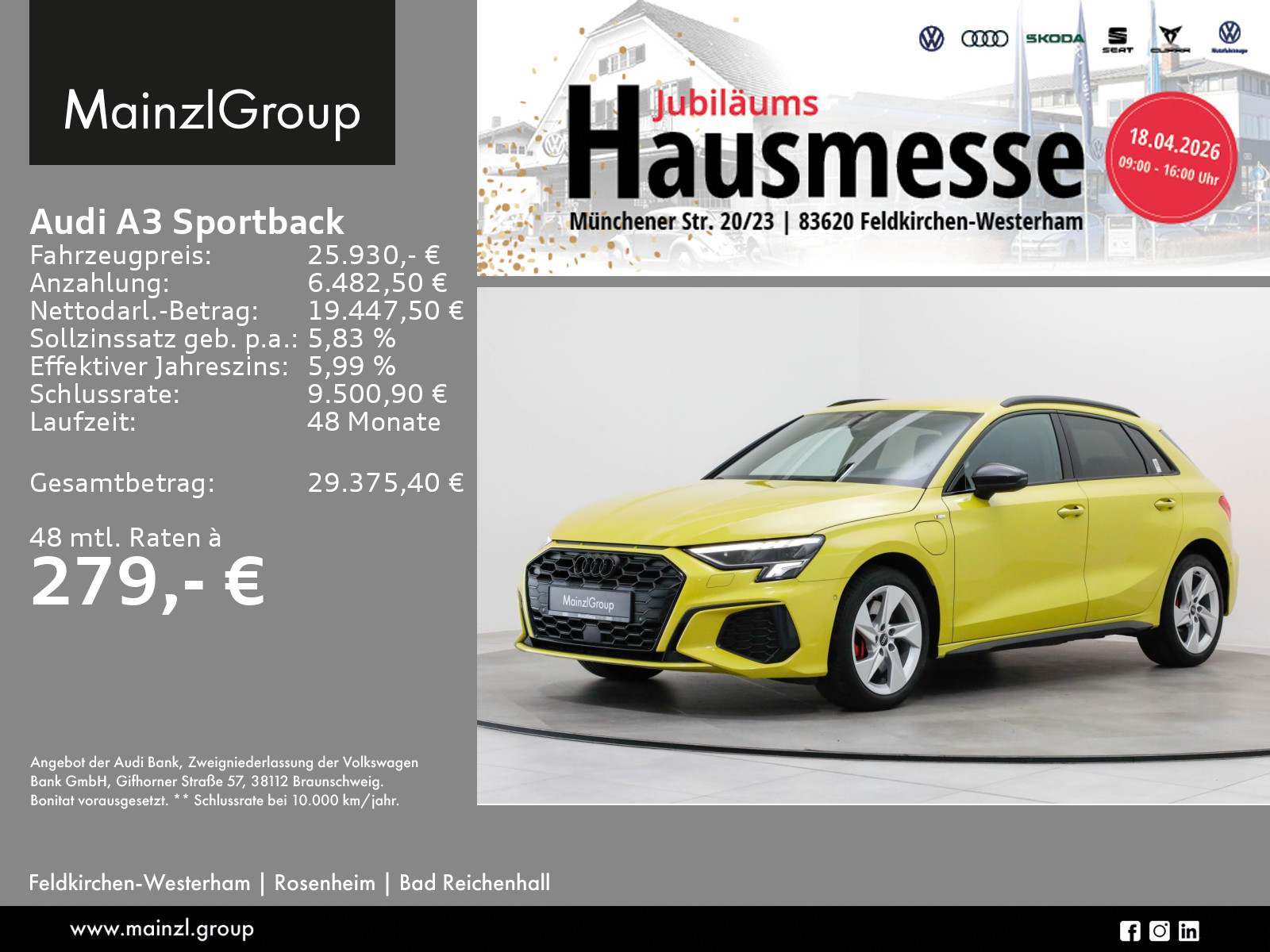 Audi Connect je nach Dienst zeitlich begrenzt, danach kostenpflichtig verlängerbar, Winterräder ggf. gegen Aufpreis vorhanden, sprechen Sie unser Verkaufspersonal darauf an., Angaben zum Hersteller: AUDI AG, Audi, Auto-Union-Straße 1, 85057 Ingolstadt, Deutschland, +49-841-89-0, kundenbetreuung(at)audi.de, Produktinformationen: https://www.audi.de/de/rechtliches/gpsr/