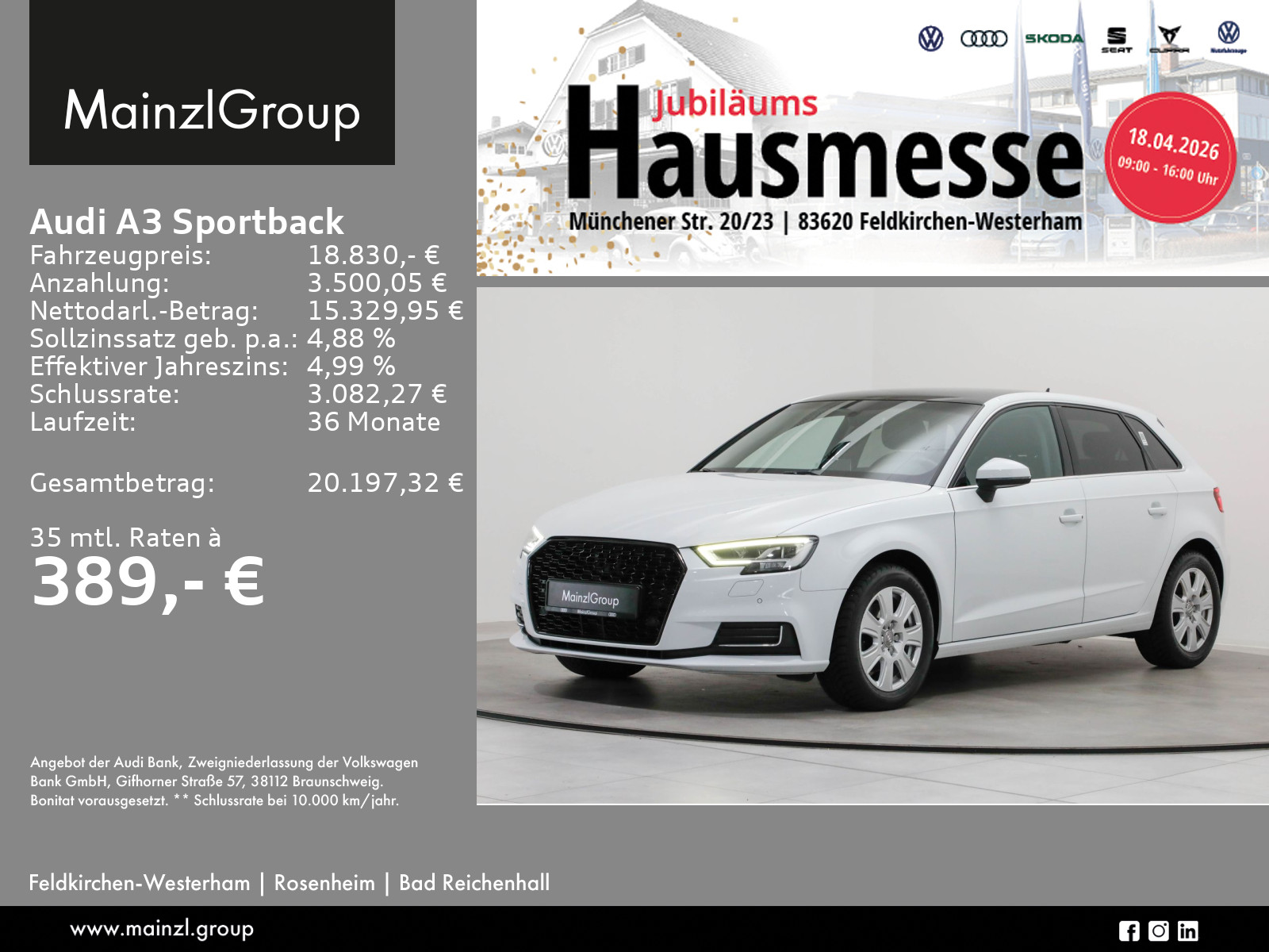 Audi Connect je nach Dienst zeitlich begrenzt, danach kostenpflichtig verlängerbar, Winterräder ggf. gegen Aufpreis vorhanden, sprechen Sie unser Verkaufspersonal darauf an., Angaben zum Hersteller: AUDI AG, Audi, Auto-Union-Straße 1, 85057 Ingolstadt, Deutschland, +49-841-89-0, kundenbetreuung(at)audi.de, Produktinformationen: https://www.audi.de/de/rechtliches/gpsr/