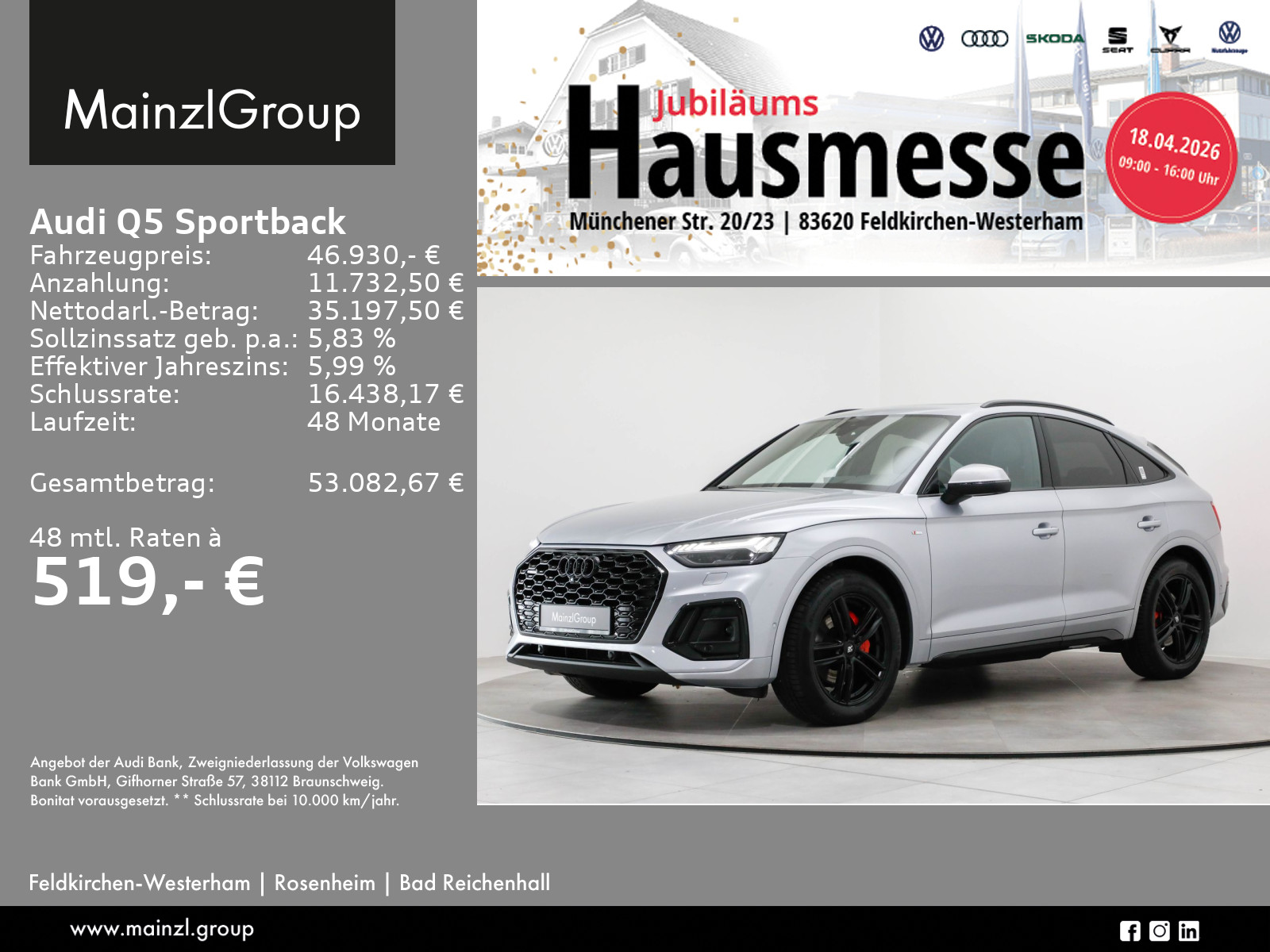 Audi Connect je nach Dienst zeitlich begrenzt, danach kostenpflichtig verlängerbar, Garantie 60 Monate ab Tag der Erstzulassung, Winterräder ggf. gegen Aufpreis vorhanden, sprechen Sie unser Verkaufspersonal darauf an., Angaben zum Hersteller: AUDI AG, Audi, Auto-Union-Straße 1, 85057 Ingolstadt, Deutschland, +49-841-89-0, kundenbetreuung(at)audi.de, Produktinformationen: https://www.audi.de/de/rechtliches/gpsr/
