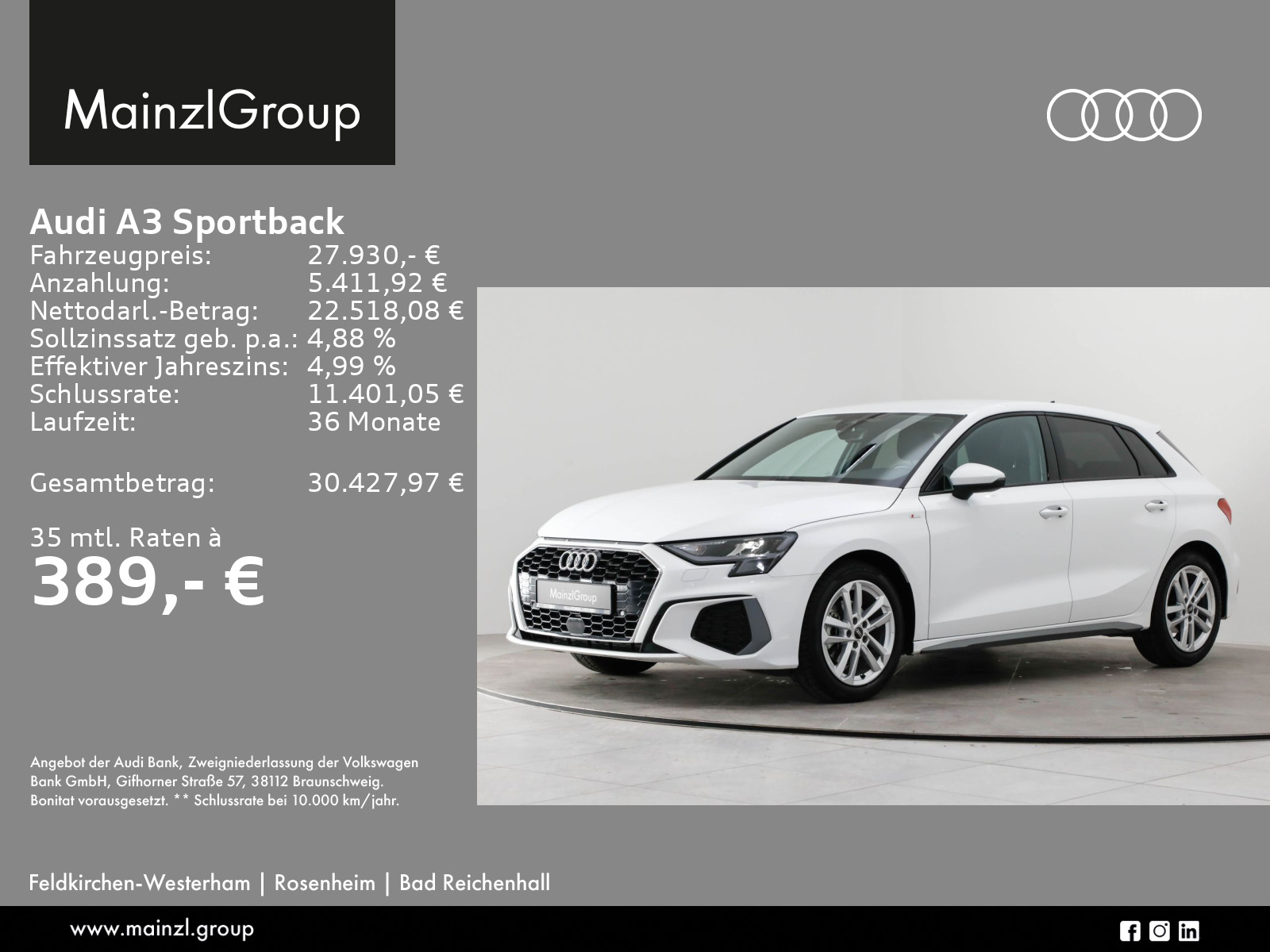 Audi Connect je nach Dienst zeitlich begrenzt, danach kostenpflichtig verlängerbar, Winterräder ggf. gegen Aufpreis vorhanden, sprechen Sie unser Verkaufspersonal darauf an., Angaben zum Hersteller: AUDI AG, Audi, Auto-Union-Straße 1, 85057 Ingolstadt, Deutschland, +49-841-89-0, kundenbetreuung(at)audi.de, Produktinformationen: https://www.audi.de/de/rechtliches/gpsr/